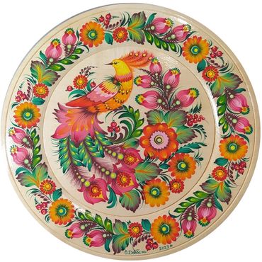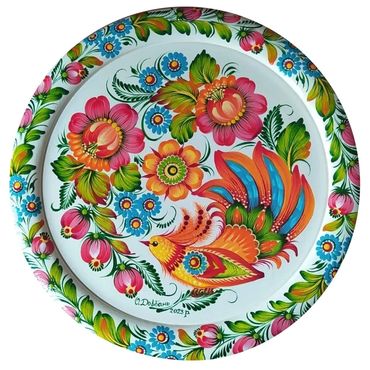 My first attempts to master Petrykivka painting began at school age. Unforgettable impressions from visiting the Petrykivka Museum of Painting, and the Petrykivka Druzhba factory gave me the impetus to choose this particular direction in art. Because Petrykivka village is so close to Kamianske town, I was exposed to Petrykivka examples in everyday life: dishes, spoons, boards, vases, panels and other decorative items painted with Petrykivka's style.