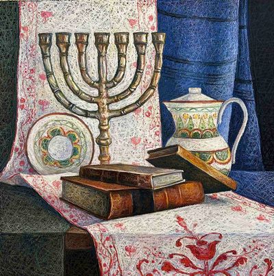 The night, illuminated by the Shabbat light, turns into a tablecloth, its yellow stripes symbolizing wheat, passing the baton to the challah, which harmonizes with the authenticity of the ceramic vessel. Bread and wine, no matter how one interprets this combination, share a common origin beneath the shadow of the Promised Land. The red viburnum, which on one hand is fragile and exciting, radiates inner strength, leaning cozily and protectively around the prayer book, as if hearing or knowing something, trying to shield it from the outside world. For this day belongs to peace, even if the cup were overflowing. The spiderweb curtains captivate with their tenderness, chaotic interweaving - a beautiful organized chaos, where everything is less clear than straight roads, but eventually, through free will and with His help, they weave into something beautiful.
