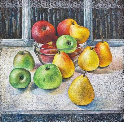 Olha Omelchyshyna loves apples as much as Cezanne − her apples and pears dominate the picture plane, gravitating towards geometric bodies, denying the darkness outside the window with their physicality and brightness. Autumn flowers in a wicker basket and bunches of ripe viburnums against the background of a snow-white tablecloth and embroidered towel are not just a still life successfully assembled by the author; they are the code of the nation, they are signs and symbols that the artist transmits to the world. Disheveled little birds and a fluffy white cat are the main characters of the animalistic compositions. This is the world around us, simple and unpretentious, but it is an integral part of life, Ukrainian identification, and ethnic culture of the people.